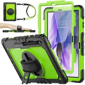SEYMAC stock Case for Samsung Galaxy Tab S7 FE / S8 Plus 5G Case 12.4'' with Screen Protector Pencil Holder [360 Rotating Hand Strap] &Stand, Drop-Proof, Green/Black