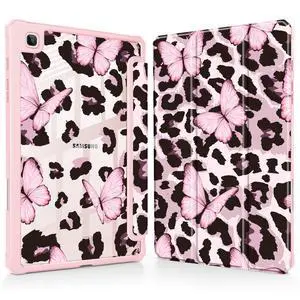 Mektron Case for Samsung Galaxy Tab S6 Lite 10.4 Inch 2024/2022/2020 with S Pen Holder, Multi-Angle Viewing with Shockproof Cover Clear Shell + Trifold Stand + Auto Wake/Sleep, Leopard Pink Butterfly