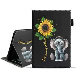 FQTBCEARI Case for Fire HD 10 Tablet (9th/7th Generation, 2019/2017 Release), Slim PU Leather Cover with Card Slot & Auto Wake/Sleep for Fire 10.1" Tablet, Elephant and Sunflower