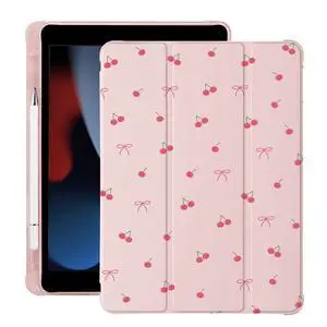Cute Kawaii Cherry Bow for iPad Air 3 Case with Pencil Holder, Auto Sleep/Wake, Pink Leather Soft TPU Back Cover for iPad Pro 10.5 Inch 2017