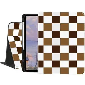 Checkerboard Case for iPad Pro 13-inch(M4)2024,Chocolate Brown Plaid Textured Folio Case with Pencil Holder Multi-Angle View Adjustable Stand Auto Wake/Sleep(Model Number:A2925/A2926/A3007) for Women
