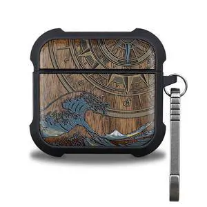 Patterit for AirPods 4 Case (2024) (USB-C), Shockproof Cover with Quick Released Keychain, Compatible with AirPods 4th Generation, Natural Wood Hand-Drawn (Compass and Wave) Walnut