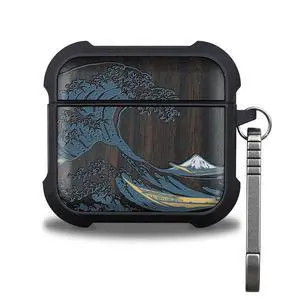 Patterit for AirPods 4 Case (2024) (USB-C), Shockproof Cover with Quick Released Keychain, Compatible with AirPods 4th Generation, Natural Wood Hand-Drawn (Great Wave) Dark Wood