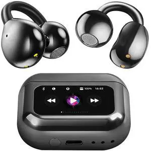 Open Ear Clip On Earbuds Intelligent Touch Color Screen Bone Conduction Wireless Bluetooth 5.4 Headphones Lightweight Comfort Sport Built-in Mic IPX7 Waterproof Earphones for Running Fitness Black