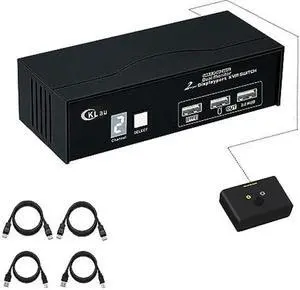 CKLau 2 Port Displayport KVM Switch Dual Monitor 4K60Hz 2K144Hz with Cables, USB 2.0 Hub, Digital Display for 2 Computers Sharing Keyboard Mouse Video