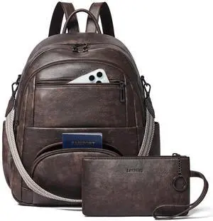 FADEON 15.6 inch Leather Laptop Backpack Purse for Women, Designer Travel PU Backpack with Laptop Compartment for Work Brown