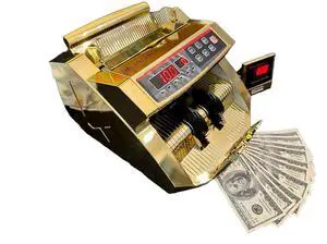 Upromax Gold Money Counter Machine - UV/MG/IR Fake Money Detector & Cash Box - Portable Bill Counter w/External LED Display - Adding Machine for Small Business Essentials 1000/Minute, (No Pens) Cash