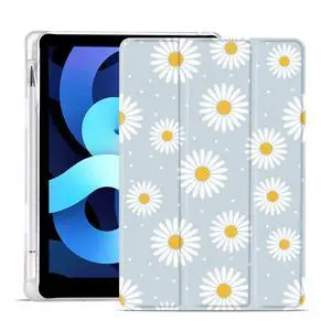 MAYCARI White Daisy Case for iPad 10.2 inch 2021/2020/2019 with Pencil Holder, Cute for iPad 9th/8th/7th Generation Protective Case with Soft TPU Back, Auto Sleep/Wake Cover Slim Shell