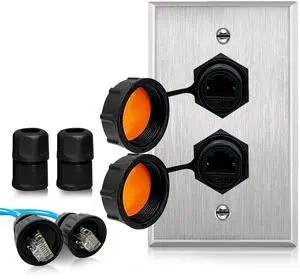 ETS Stainless steel dual gang wall plate w/double IP68 outdoor RJ45 CAT6 jack pass through jack coupler connection type, connector cover cap, cable gland