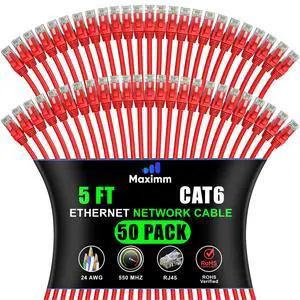 Maximm Cat 6 Ethernet Cable - 5 ft (50-Pack) - High-Speed LAN, Internet, Patch, Network Cable - UTP, 10Gbps, 550MHz Ethernet Cord - Red