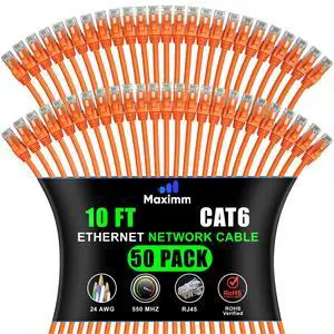 Maximm Cat 6 Ethernet Cable - 10 ft (50-Pack) - High-Speed LAN, Internet, Patch, and Network Cable - UTP, 10Gbps, 550MHz Ethernet Cord - Orange