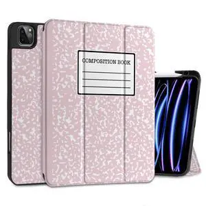 MEEgoodo for iPad Pro 12.9 Case M2 6th/5th/4th/3rd Generation 2022 2021 2020 2018 with Pencil Holder, Tablet Cover with Soft TPU Back Shell, Pink Composition Book
