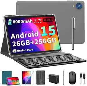 Android 15 Tablet 10 inch, 2 in 1 Tablets with Keyboard Case Mouse Stylus, 8GB RAM 32GB ROM 1TB Expand, Quad Core Processor Tablet, WiFi, BT, 1280x800 HD Screen, 6000mAh, Dual Camera, GMS, Widevine L1