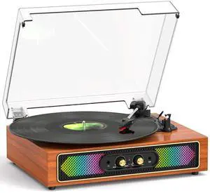 Bluetooth Record Player with RGB Lights, 3-Speed Belt-Drive Turntable with Built-in Stereo Speakers, Bass/Treble Control, Auto Stop, AUX in/Out, RCA Out, Retro Wood Vinyl Player for Home & Gift Use