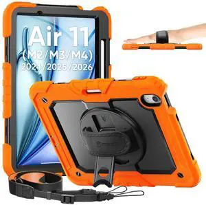 timecity Case for iPad Air 11 Inch M3/ M2 (2025/2024), 360 Rotating Stand, Pencil Holder & Wireless Charging, Shockproof with Screen Protector & Shoulder Strap - for Designers, Orange