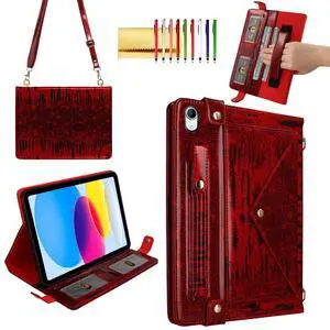 Glitter Case for iPad 2025 (A16) 11-inch/iPad 10th Generation, Techcircle Crossbody Folio Stand Card Holder Pencil Pocket Protective Cover with Hand Strap+Shoulder Strap, Burgundy