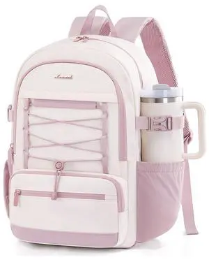 LOVEVOOK School Backpack for Teen Girls, Large Capacity College Student Backpacks with Water Bottle Holder, Cute Laptop Backpack Purse for Women, Lightweight Casual Travel Backpack, Beige-pink