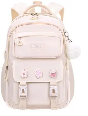 MININAI Cute Backpack for Kids Teen Girls Large Kawaii Aesthetic Elementary Middle School Student Bookbag Preppy Laptop Backpack for Ages 6-8 8-10 10-12 with Pin Accessories Plush Pendant, Beige
