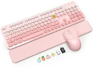 Wireless Keyboard and Mouse Combo, Magnetic Soft-Touch Wrist Rest, Round Keycaps, Full-Size Retro Typewriter Keyboard, 2-Stage Tilt Legs, Auto Sleep, 2.4GHz Cordless for Windows PC, Blush Pink Ombre