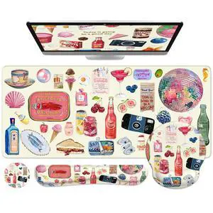 iLeadon Large Desk Cover Mat, Non Slip Gel Mouse Pad with Wrist Support Extra Large, Computer Desk Mat with Keyboard Wrist Rest and Mouse Pad Set, Computer Mats for Desktop Women (Vintage Stickers)