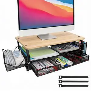 Bingyouth Desk Organizers and Accessories Monitor Riser, Monitor Stand with Drawer (2-Tier Drawers) with Large Side Storage Rack & Cable Management,66LBS/30KG, Office Organization, Oak