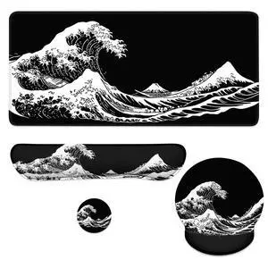 Wave Mouse Pad Set Japanese Black White Mount Fuji Kanagawa Gaming Mousepad 4in1 Desk Mat for Desktop Anti-Slip XXL Big Computer Ergonomic Mousepad with Wrist Support for Keyboard and Mouse