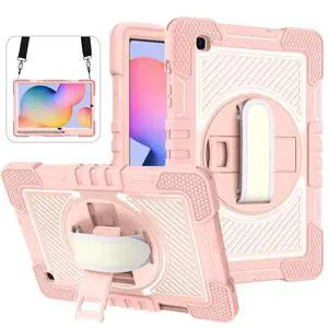 YOUULAR Tablet Case for Samsung Galaxy Tab S6 Lite 10.4 inches SM-P610N, Tablet Shockproof Cover with 360 Rotating Stand and Wrist Strap, Shoulder Strap Pink Gold