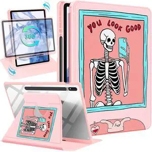 Wazzasoft for Samsung Galaxy Tab S7 Fe/S7 Plus/S8 Plus Case 12.4 Inch Folio Cover Pencil Holder Women Girls Cute Girly Skeleton Unique Design Rotating Tablet S8 Plus 2022/S7 Plus 2021/S7 FE 5G Cases