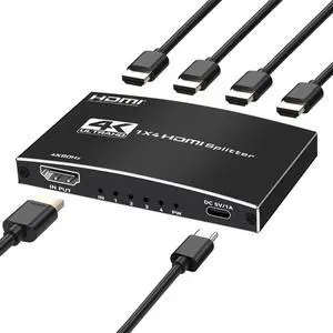 HDMI Splitter 1 in 4 Out, 4K@60Hz 1 x 4 HDMI Splitter Supports 3D & 1080P@60Hz, Duplicate/Mirror One Source to Four Displays, Ultra HD High Speed Splitter for PC, Laptop, B0X, PS5, Roku, TV-Black