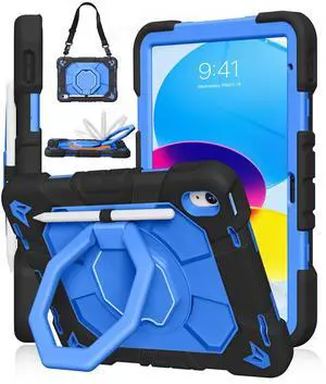 JKSML Case for iPad (A16) 11th/10th Gen ^^ 360 Rugged Rotating Stand ^^ Pencil Holder ^^ Adjustable Shoulder Strap ^^ Heavy Duty Drop Protective Cover for iPad 10.9" (2022)/ 11" (2025) - Blue Black-z