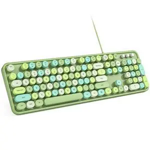 MOWUX Computer Keyboard Wired, Plug Play USB Retro Round Typewriter Keyboard, Full Size Wired Keyboard with Foldable Stands for Laptop and Office PC - Green Colorful