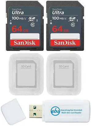 SanDisk Ultra 64GB (2 Pack) SDXC UHS-I Card Class 10 SDSDUNR-064-GN3IN Bundle with 2 SD Card Cases and 1 Everything But Stromboli Memory Card Reader