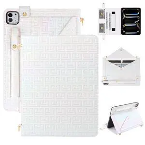 Dteck for iPad Pro 11" (M4/M5) Glitter Gradient PU Leather Folio Case with Shoulder Strap, Pencil Holder, Pocket, Card/Cash Slots, Button Closure, Heavy Duty Protective Shockproof Stand Cover, White