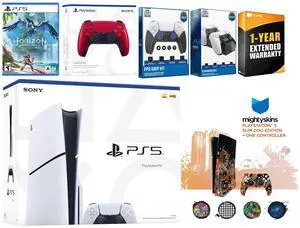 Sony Playstation 5 Slim Disc with Horizon Forbidden West, Extra Volcanic Red Controller, FPS Grip Kit, Charge Dock and MightySkins Decal Voucher + 1 Year CPS Extended Warranty