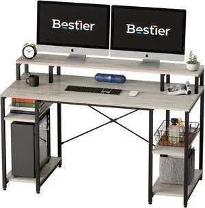 Bestier Gaming Desk with Monitor Shelf, 55 inches Home Office Desk with Open Storage Shelves, Writing Study Table Workstation for Small Space, Wash Gray