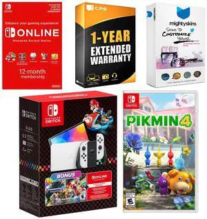 Nintendo Switch OLED Console Mario Kart 8 Bundle with Pikmin 4, NSO 12 Month Family Membership, MightySkins Console and Controller Skin Voucher, and 1 Year CPS Extended Warranty