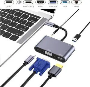 USB C Hub, USB 3.1 Type-C to HDMI VGA Adapter with 4K HDMI, 1080P VGA, USB 3.0, PD Pass-Through Charging, 3.5mm Audio Port, Dual Screens Display for Mac Pro and Other Laptops with Thunderbolt 3 Port