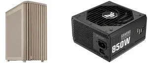 ASUS Pro Art PA401 Wood Edition Beige Mesh-panel PC Case - FSC®-Certified Wooden Front, Elegant Sustainable Design, Dual 160mm Fans, 120mm Rear Fan, Integrated Fan Hub. ASUS TUF Gaming 850W Gold (850 Watt, ATX 3.0 Compatible, Fully Modular