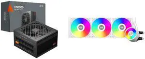 PCCOOLER CPS KN1000 Fully Modular Power Supply, 80 PLUS Gold 1000W PSU, Native 12V-2x6 Connector, ATX 3.1 & PCIe 5.1 Ready, Dual CPU Power Cables, 105°C Rated Japanese Capacitors, P3-KN1000-G1F and PCCOOLER CPS DC360 Pro ARGB Display AIO CPU Liquid Cooler, 360mm Radiator, 310W TDP, Customizable 2.4" IPS LCD Display, Ceramic Bearing, for Intel LGA 1851/1700/1200/115X & AMD AM5/AM4, White