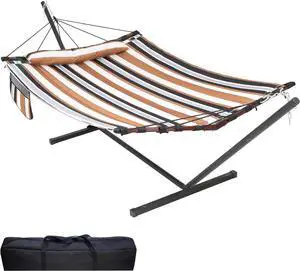 12FT 2 Person Hammock with Stand Included 55 x 79IN Large Hammock 450LB Capacity with V Shaped Hardwood Spreader Bar & Nylon Rope for Outside, Patio, Garden, Backyard, Beach- Coffee Stripes