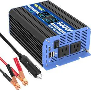 500 Watt Pure Sine Wave Inverter, 12V DC to 110V 120V AC Converter with Two Outlets, USB Charging Ports, One Type-C Clear LCD Display, Car Charger Plug Power Inverter 500W