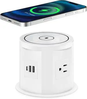 Pop up Outlet for countertop with 15W Wireless Charger, 4.7-inch pop 4 outlets and 2 USB-A, 1 USB-C, Kitchen countertop, Conference Room, Study Room (White)