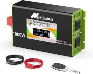 1000W Pure Sine Wave Power Inverter - Car Power Inverter 12v to 110v,Converter with 2 AC Outlets,2000W Peak,LCD Display,Remote Control,Power Inverters for Vehicles,Converter for RV,Truck,Solar,Outdoor