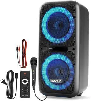 Dolphin Dual 12" Bluetooth Party Speaker - Portable Large Speaker with Wired Microphone, Multicolor LED Lights, USB Playback, Hi-Fi Amplifier, Powerful Bass, 5-Band Equalizer, Long-Lasting Battery