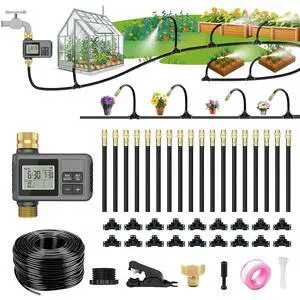 60Ft Drip Irrigation System with Smart Water Timer Automatic Garden Watering Kit with Solid Brass Metal Connectors, 360° Adjustable Nozzles & Bendable Tubing for Garden, Greenhouse & Lawn
