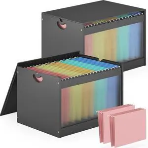 Hanging File Box Organizer for Letter Size, 2 Pack Bamboo Acrylic File Folder Storage with Lid Clear Moving Boxes Wood with Handle Desktop Filing Holder for Office Banker Document