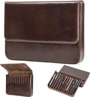 Top Grain Genuine Leather 12 Fountain Pen/Pencil Tray Case, Minimalist Fashion Design, Handmade, Magnetic Closure with Drawer, Gift Choice for Man/Woman/Office, Glossy Coffee, 12 Slots