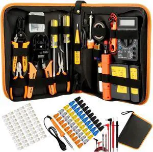 LEATBUY Network Crimp Tool Kit for RJ45/RJ11/RJ12/CAT5/CAT6/Cat5e/8P, Professional Crimper Connector Stripper Cutter, Computer Maintenance Lan Cable Pliers Tester Soldering Iron Set(Orange)