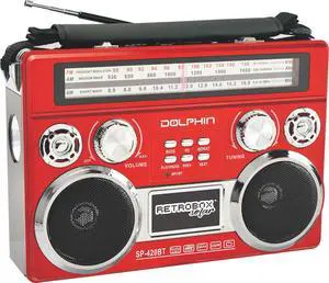 Dolphin SP-420BT Solar Rechargeable RETROBOX Portable Bluetooth Radio with Bluetooth, AM/FM/SW 3-Band Radio, MP3 Player, LED Flashlight, and Solar Charging - Black or Red (Red)