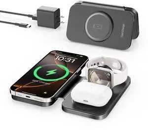 3 in 1 Wireless Charging Station for Apple Devices,Portable Foldable Magnetic Multiple Fast Charger Stand,Wireless Charger MagSafe for iPhone 17 16 15 14 13 12 11 Pro Max Air Plus/Apple Watch/Airpods